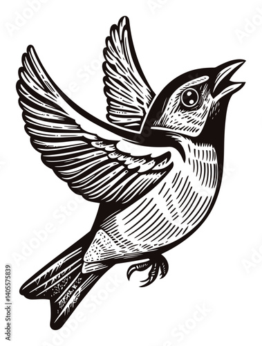© Meli, Obraz premium Intricate Engraved Bird Design with Wings Spread in Flight