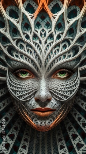 © tilialucida, Naklejka premium Intricate face design with tree-like patterns and green eyes