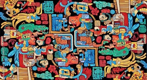 © Shahid, Obraz premium Intricate figurative pattern in a seamless repeating design of dynamic Mesoamerican priests and warriors