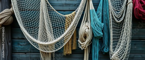 Fototapeta premium Intricate fishing nets draped over weathered wood, ample copy space, beige,...