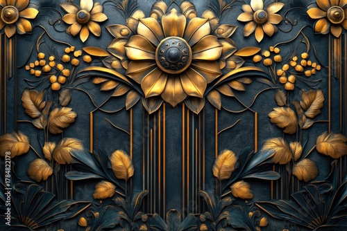 © Larisa, Fototapeta premium Intricate floral relief design with golden accents on deep blue