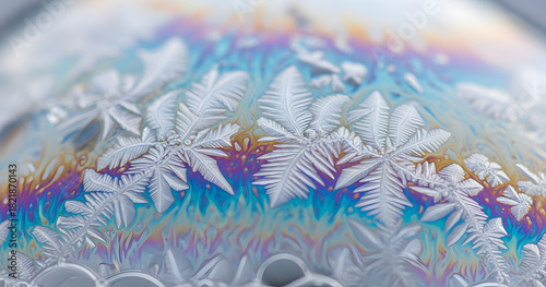Obraz premium Intricate frost patterns adorn a surface reflecting a spectrum of rainbow...