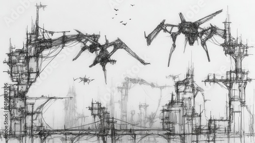 Obraz premium Intricate, futuristic cityscapes sketched in pencil.