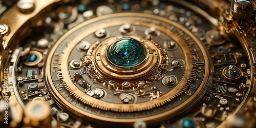 © BYAI, Fototapeta premium Intricate gears and glowing orb create a mesmerizing display of steampunk-inspired design in a close-up view