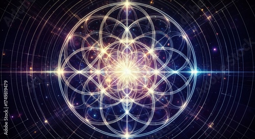 Obraz premium Intricate Geometric Pattern with Radiating Light and Symmetrical Shapes Representing Cosmic Energy and Universal Harmony