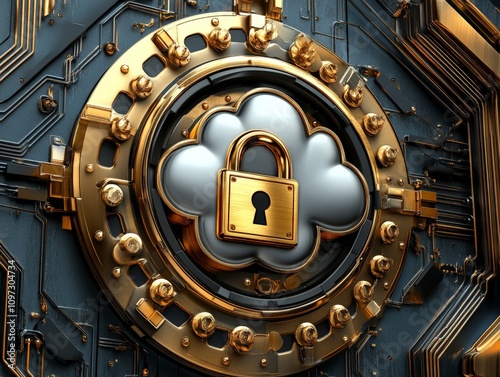 Fototapeta premium Intricate gold and metallic lock embedded in a cloud design surrounded by detailed gears, symbolizing advanced data security, encryption, and cloud based technology systems
