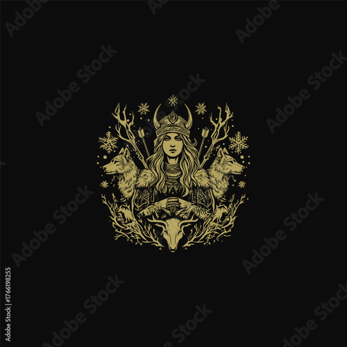 © Seraphyn, Fototapeta premium Intricate gold illustration of a Nordic goddess or queen wearing a horned helmet, surrounded by twin wolves, deer antlers, and natural elements like branches and snowflakes