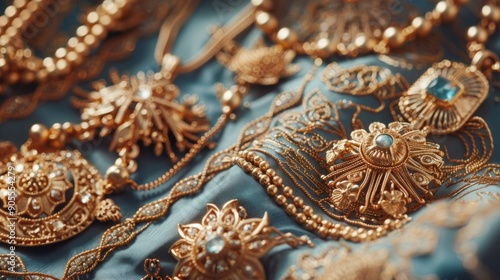 © Pornarun, Obraz premium Intricate gold jewelry with gemstones rests on a textured blue fabric.