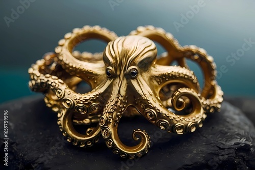 © Anna, Obraz premium Intricate golden octopus figurine resting on a dark stone surface Generative AI