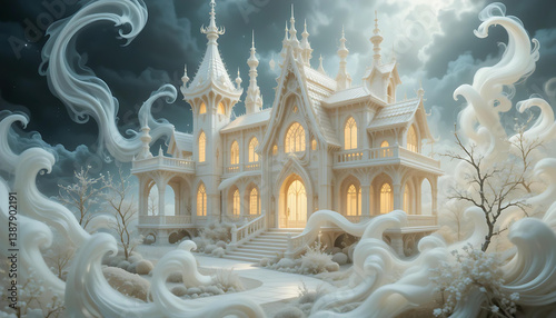 © Afshan, Fototapeta premium Intricate Gothic Mansion Surrounded by Leafless Trees and Wispy Clouds, Creating a Mystical, Ethereal Atmosphere.