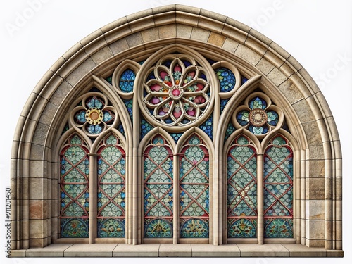 © Sirinporn, Obraz premium Intricate Gothic window with arched stone framework and stained glass detailing, beautifully isolated on a clean white background, emphasizing its architectural elegance.