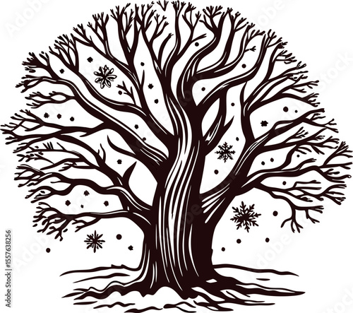 Obraz premium Intricate hand drawn winter tree with bare branches and snowflakes in vintage engraved illustration