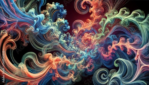 © Oxy Maru, Obraz premium Intricate kaleidoscopic smoke trails in vivid fluorescent colors twisting endlessly into abstract forms created using generative AI for banners.