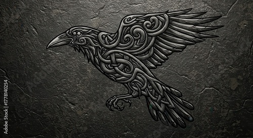 Obraz premium Intricate knotwork design depicting a bird in flight overlaid on a dark, textured stone background