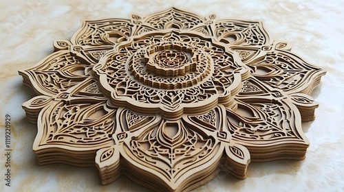 © AI_Nusantara, Obraz premium Intricate layered wooden mandala art.