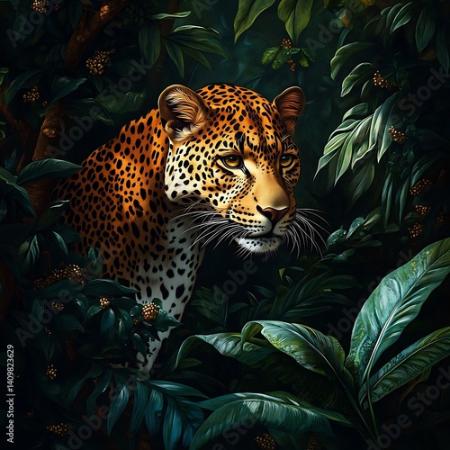 Naklejka premium Intricate leopard fur and intense eyes in tropical jungle image