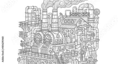 © Ariestia, Obraz premium Intricate line art depicts a complex industrial facility featuring multiple boilers and smokestacks