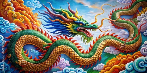 © Man888, Fototapeta premium Intricate Long Dragon Drawing with Elaborate Details and Flowing Form in a Fantastical Style