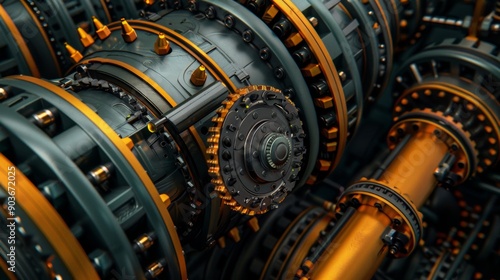 © Nattanon, Fototapeta premium Intricate machinery close-up featuring detailed gears and components with metallic and orange accents, showcasing industrial engineering.