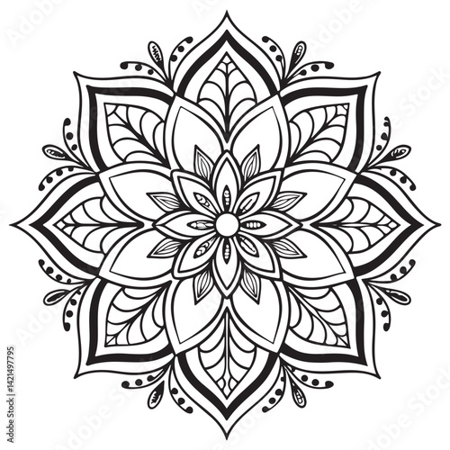 Fototapeta premium Intricate Mandala Design Symmetrical Floral Pattern in Black and White Line Art