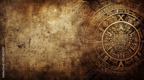 Naklejka premium Intricate Mayan calendar on a weathered, aged stone background.