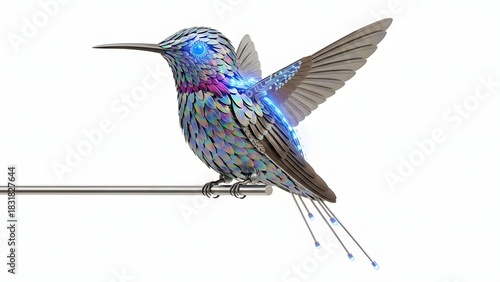 © Silhouette Store, Obraz premium Intricate metal hummingbird sculpture perched on a thin rod isolated on white background