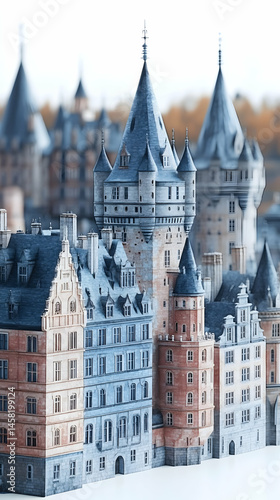 © abid, Fototapeta premium Intricate miniature cityscape featuring numerous grey, brown, and beige buildings with pointed roofs, reminiscent of a medieval European town