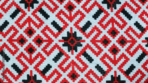 © mirukser, Obraz premium Intricate Mirukser textile pattern showcasing vibrant red and black designs on a white backdrop in natural light