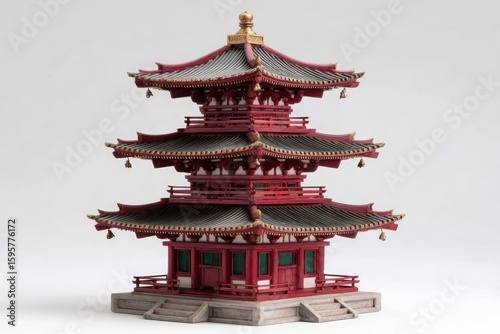 © NovaStock, Fototapeta premium Intricate multi tiered japanese pagoda model with red and green details against a white background