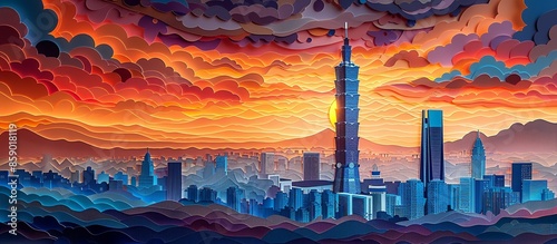 Obraz premium Intricate paper cut artwork of Taipei 101, showcasing the towering skyscraper against the backdrop of a bustling cityscape in a beautifully detailed and colorful style. Illustration, Minimalism,
