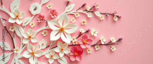 © Watcharkorn, Fototapeta premium Intricate paper cut floral design, delicate blossoms on soft pink background, ample copy space, soft, romantic