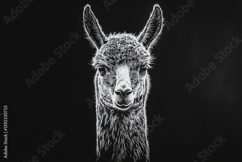 Obraz premium Intricate Pen and Ink Llama Portrait. A detailed pen and ink illustration features a llama's face, highlighted against a black backdrop, capturing the animal's inquisitive gaze.