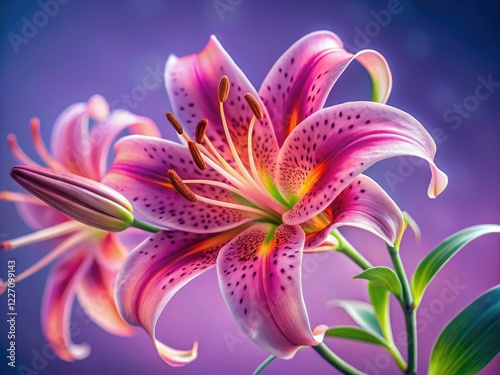 © Autun, Fototapeta premium Intricate pink tiger lily, close-up, bokeh lilac backdrop.