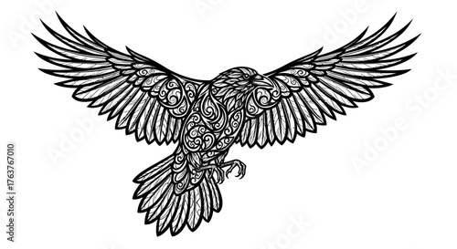 Obraz premium Intricate raven illustration with ornate patterns and soaring wing design...