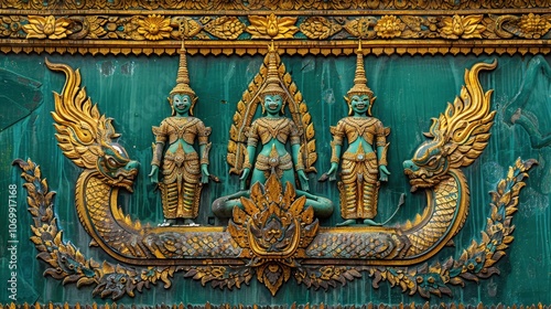 © PStyle, Fototapeta premium Intricate Relief of Three Celestial Beings and Mythical Creatures at Wat Phra Kaew, Bangkok