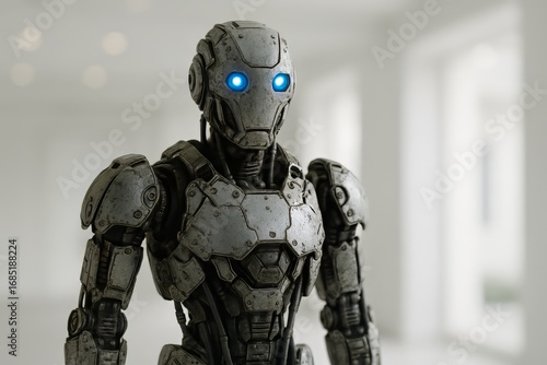 Fototapeta premium Intricate robotic figure with glowing blue eyes. Advanced AI automation...