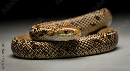 Obraz premium Intricate scales of a coiled rattlesnake reveal mesmerizing patterns and piercing gaze, evoking primal fear and natural wonder