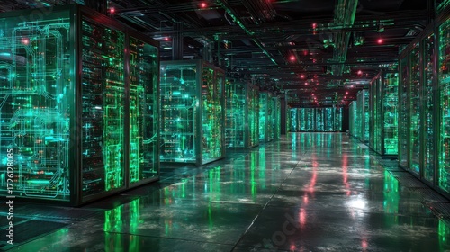© Taru, Fototapeta premium Intricate Server Room, Glowing Green Technology, Dark Corridor.
