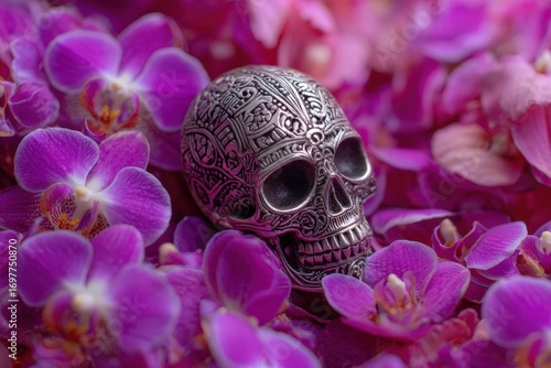 Fototapeta premium Intricate silver skull rests amidst a profusion of vibrant purple orchids,...