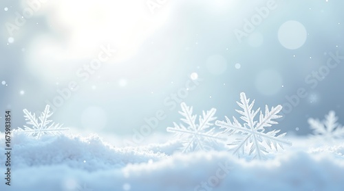 © Nayanika, Naklejka premium Intricate snowflakes shaped like delicate flowers float gently against a simple, light-colored backdrop