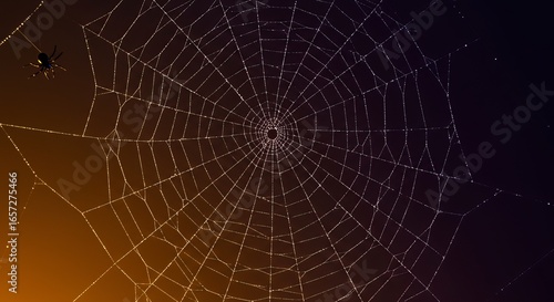 © P AI, Fototapeta premium Intricate Spider Web with Dew Drops Glowing Against Dark Background