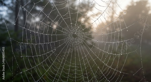 © Tharusha, Naklejka premium Intricate spider web with dew drops in soft forest background