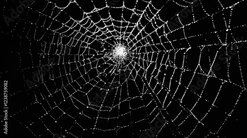 Obraz premium Intricate spider web with dewdrops on black background