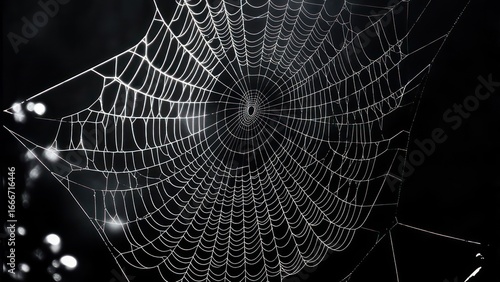 Naklejka premium Intricate Spiderweb Against Dark Backdrop, Illuminated by Glimmering Light