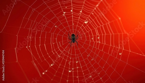 Obraz premium Intricate spiderweb detail, dewdrop, spider silhouette, dark orange backdrop,...