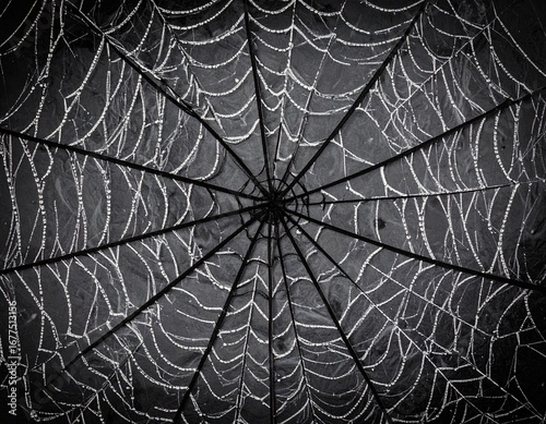 © Helmi, Obraz premium Intricate spiderweb glistening with morning dew, radiating design, detailed texture.