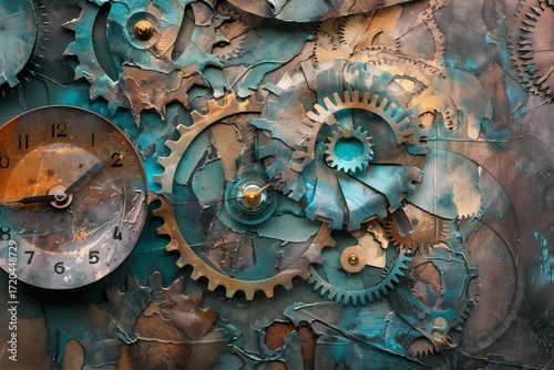 © abuzarnaqvii, Fototapeta premium Intricate steampunk clockwork mechanism with rusty gears and aged patina
