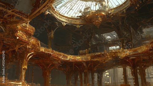 © Jakkarin, Obraz premium Intricate Steampunk Interior with Golden Details and Skylight Design