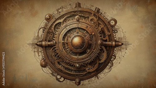 Naklejka premium Intricate steampunk-style clockwork mechanism, circular design on aged paper background.