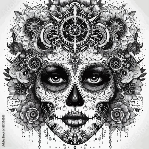 Fototapeta premium Intricate sugar skull artwork adorned with flowers and gears in detailed line...